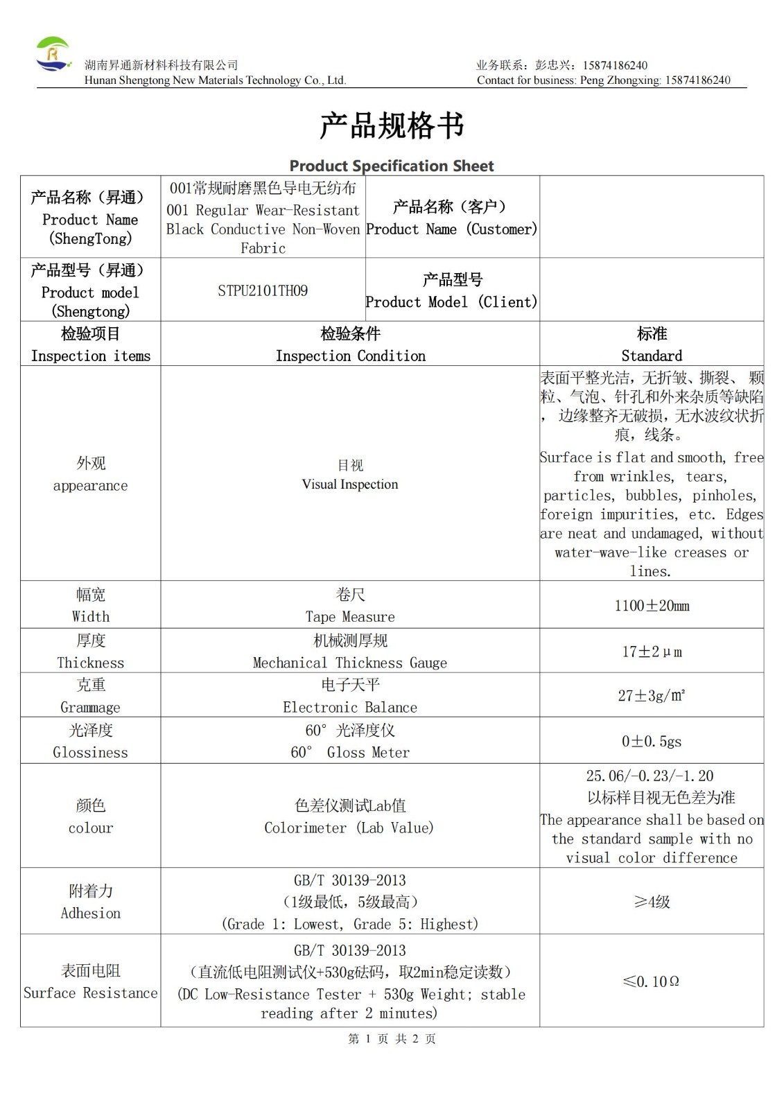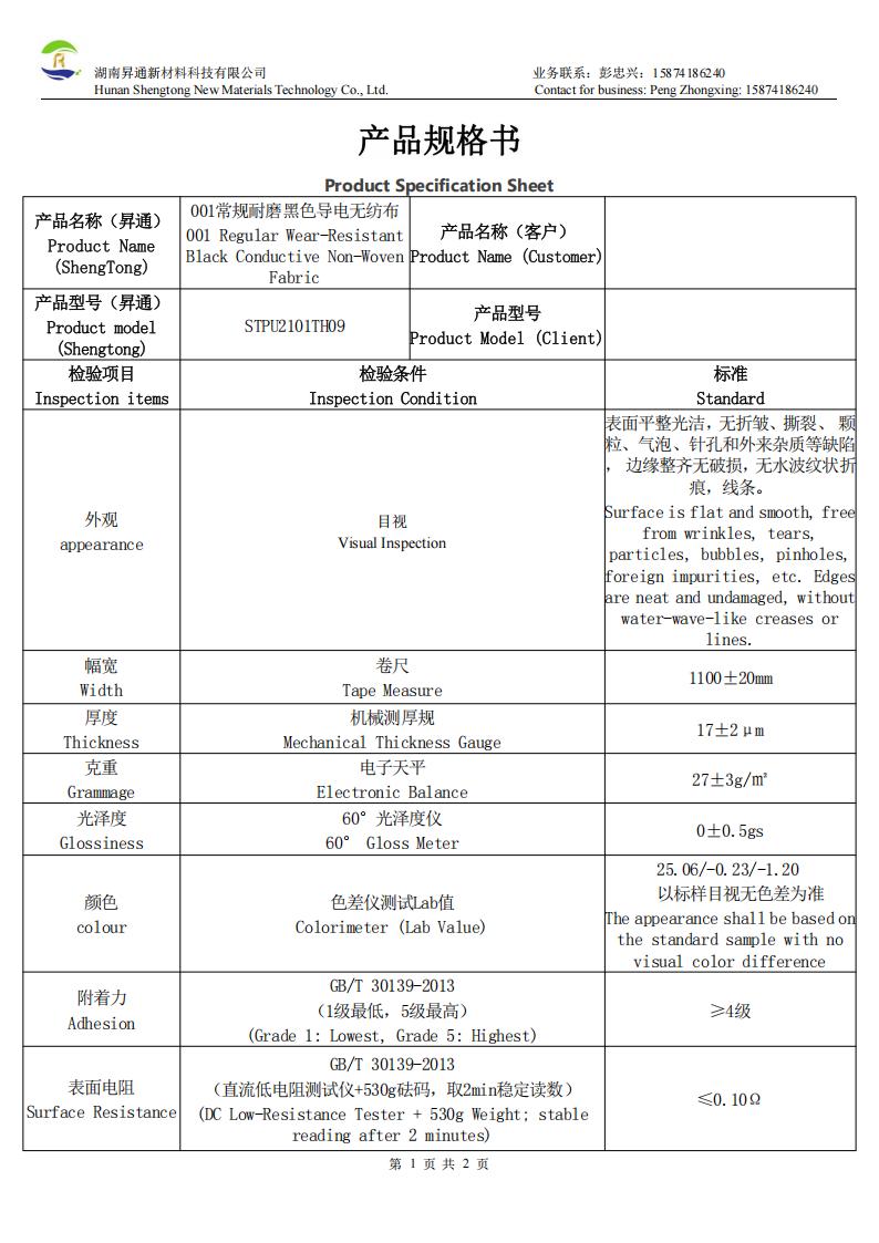 12um耐酒精黑色导电无纺布是一款超薄、双面导电(银灰面/哑光黑面)、具备极低表面电阻(≤0.05Ω)的高性能材料。其黑色面为中性哑光黑(色差25.22/-0.16/-0.91)。该材料表面涂层耐酒精、耐磨,可直接模切或贴胶,方便加工。采用环保的纯水性涂层工艺,无VOC残留。特别适用于对厚度、导电性、耐用性、环保性及易加工性有严苛要求的应用场景,如精密电子元件、电磁屏蔽、传感器、医疗设备等领域。