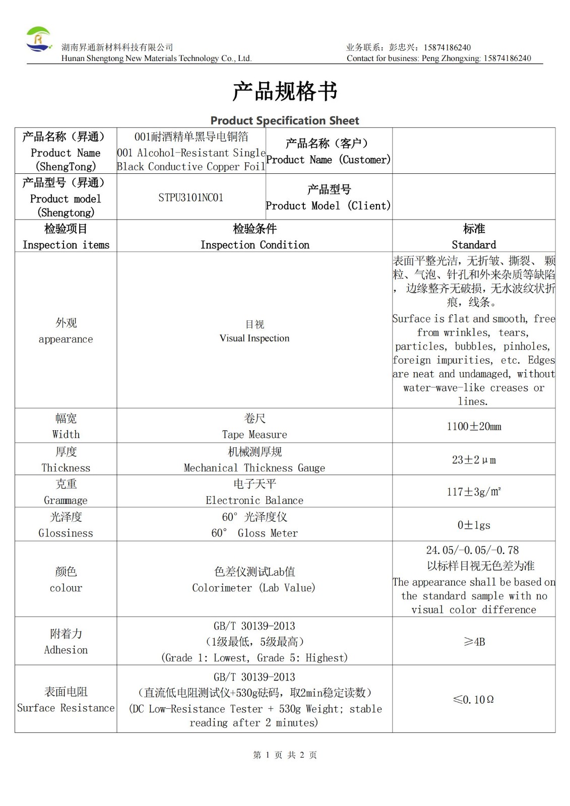 30微米耐磨黑色导电布是以聚酯纤维为基材,双面覆铜镍合金提供基础导电性(表面电阻≤0.05Ω),并单面涂覆黑色水性石墨烯涂层制成的高性能复合材料。其核心结构为黑色耐磨表面(哑黑) 搭配 银灰色导电面,提供双面导电功能。产品实测厚度为33-34μm,具有优异的导电性能。其哑光黑色面呈现低亮光效果(光泽度3.2-3.4gs),颜色稳定(色差值25.74/0.05/0.12),并特别强调耐磨特性。该导电布采用纯水性环保涂层工艺制造,确保无VOC残留,符合安全环保要求。产品幅宽为1100±20mm,可直接模切加工或贴合胶带,便于集成应用,适用于需要高导电性、耐磨性及环保要求的电磁屏蔽、接地等电子应用场景。