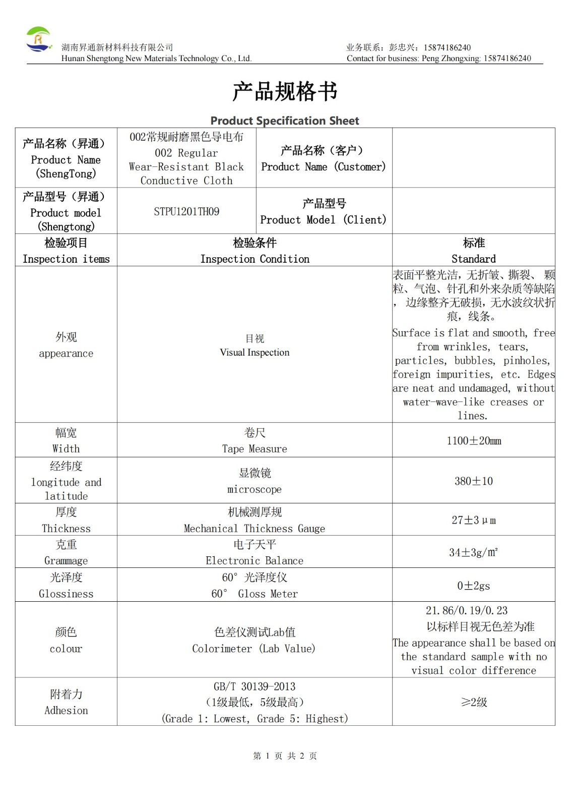 20μm耐酒精黑色导电布-1是以聚酯纤维为基材,双面覆铜镍合金提供基础导电性,并单面涂覆黑色水性石墨烯涂层制成的高性能复合材料。其核心结构为黑色耐磨表面(哑黑) 搭配银灰色导电面,提供双面导电功能。产品实测厚度为27-28μm,具有优异的导电性能。其黑色面呈现哑光效果(光泽度0gs),颜色稳定(色差值21.86/0.19/0.23),并特别强调耐磨特性。该导电布采用纯水性环保涂层工艺制造,确保无VOC残留,符合安全环保要求。产品幅宽为1100±20mm,可直接模切加工或贴合胶带,便于集成应用,适用于需要高导电性、耐磨性及环保要求的电磁屏蔽、接地等电子应用场景。