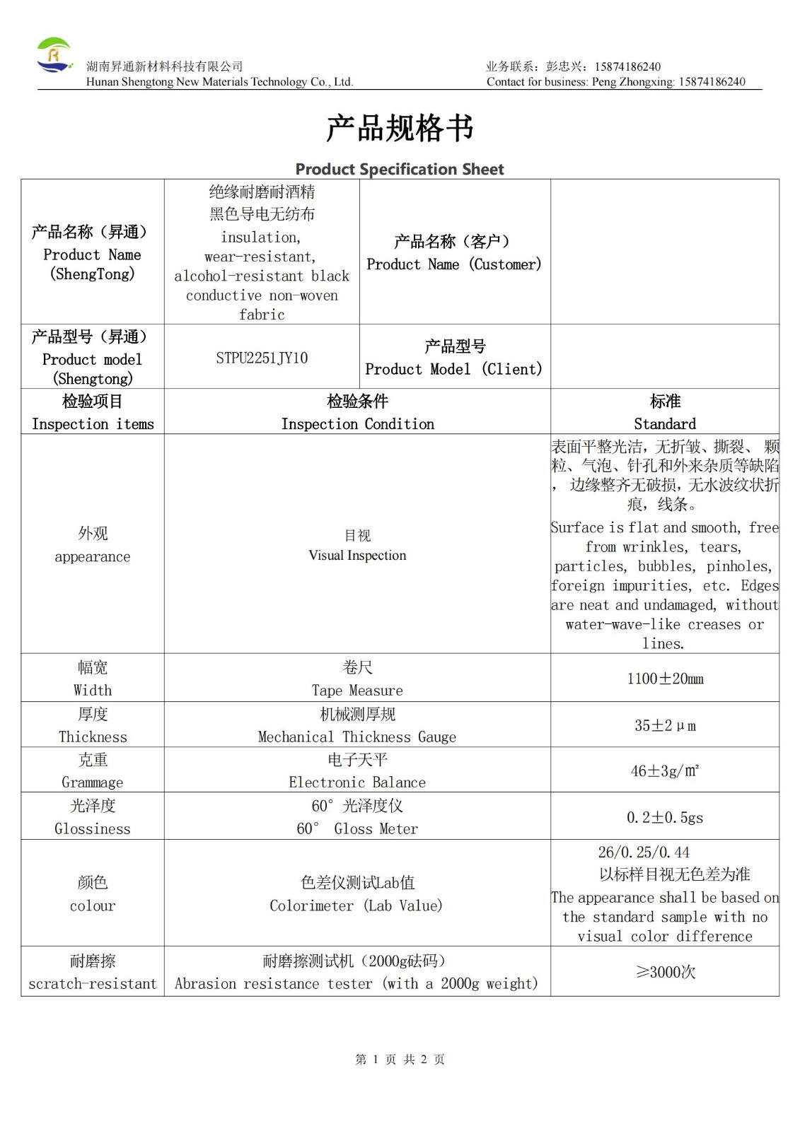 The 30μm insulating alcohol-resistant black conductive cloth is made by coating the surface of polyester fibers with metals such as copper and nickel, followed by treating one surface with a black water-based graphene electromagnetic shielding coating. The black insulating surface has an insulation resistance of >10¹⁰Ω and a thickness of 38±3μm. The insulating layer presents a low-matte blue-black color with a glossiness of 0.5 and stable color difference (Lab value: 26.45/-0.17/-1.12). It adopts a purely water-based and environmentally friendly coating (free of VOCs) and features excellent wear resistance and alcohol resistance. It supports direct die-cutting or composite adhesive layer processing, and is suitable for electromagnetic shielding, anti-static protection of precision electronic components, and industrial corrosion-resistant scenarios.
